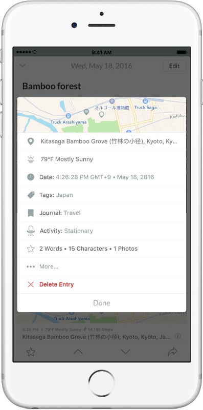 In the Day One app you create journal entries. Each entry can have photos, text, location, and it also records music you are listening to or activity such as how many steps you've walked that day. You can also tag locations with more specific data using Apple Maps or Foursquare.