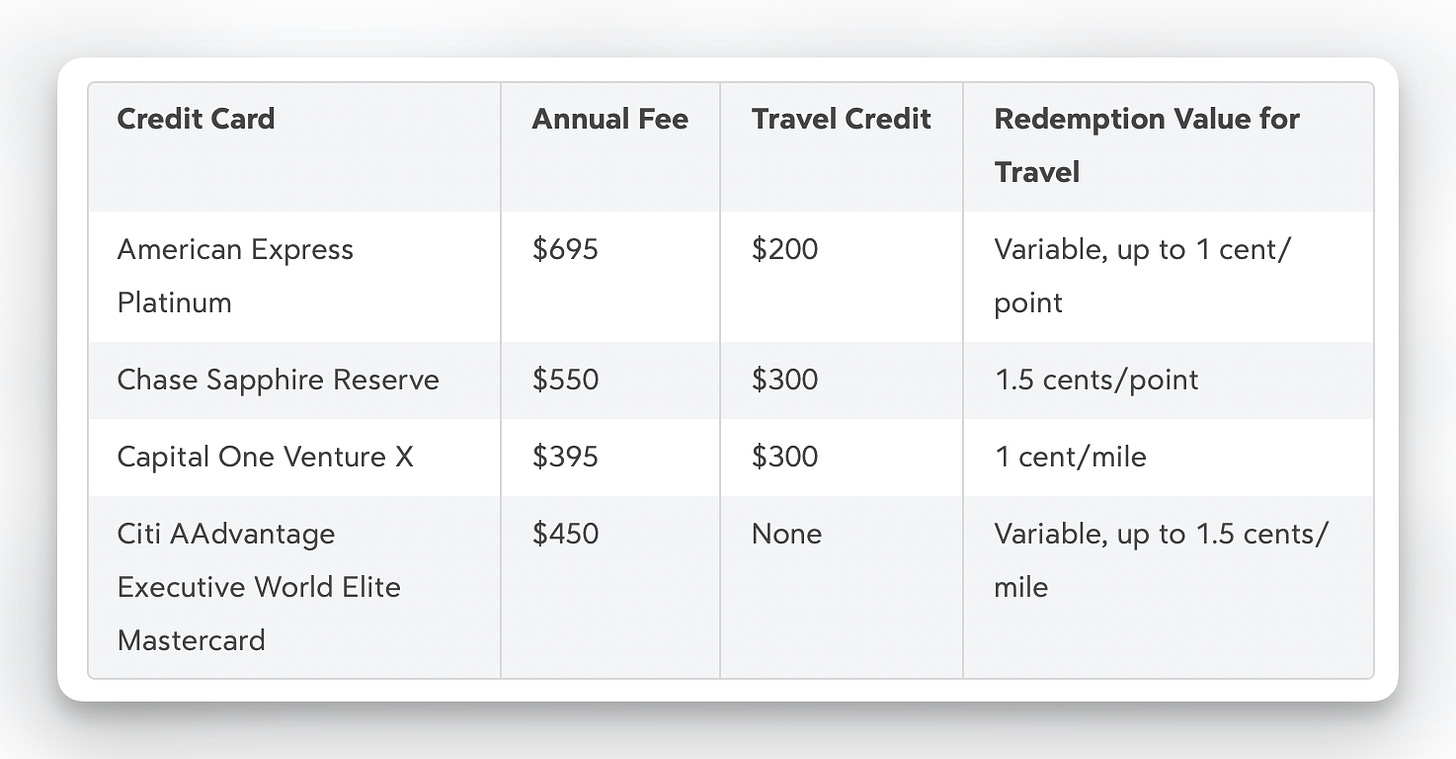 The table above displays the annual fees, travel credits, and redemption value for travel for each credit card. Note that the redemption value for travel may vary depending on the specific redemption options available with each card issuer.