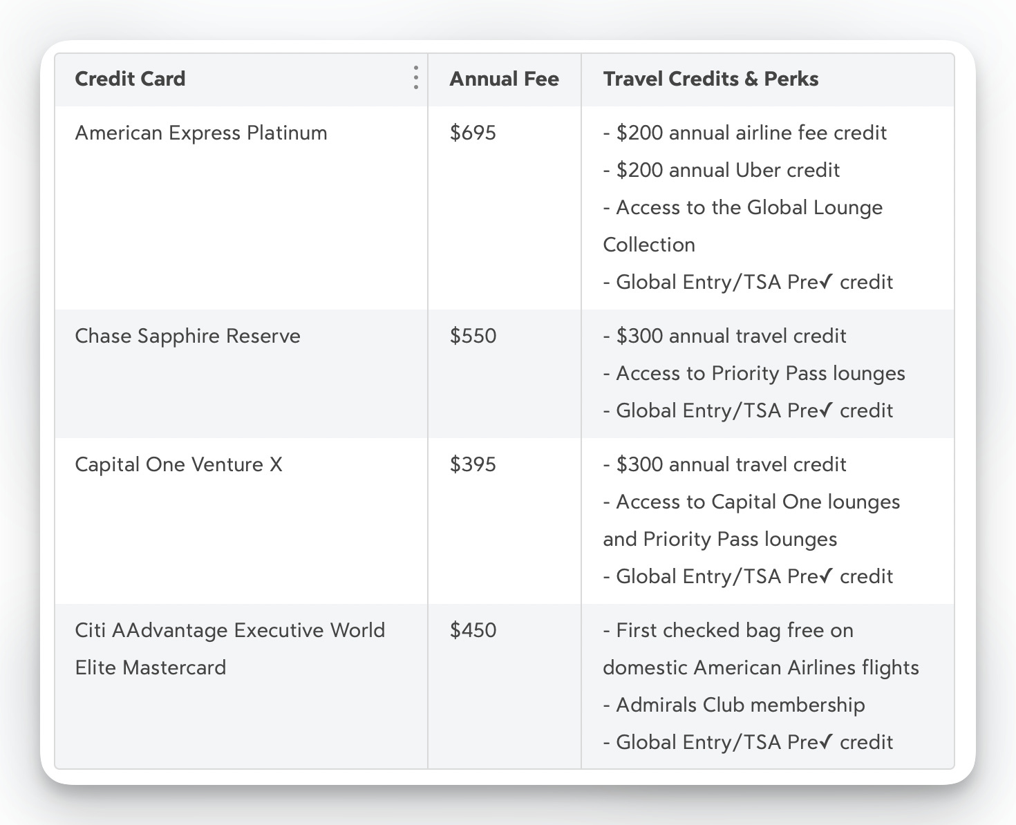 Amex Platinum, Chase Sapphire Reserve, Capital One Venture X, and Citi AAdvantage Executive World Elite Mastercard
